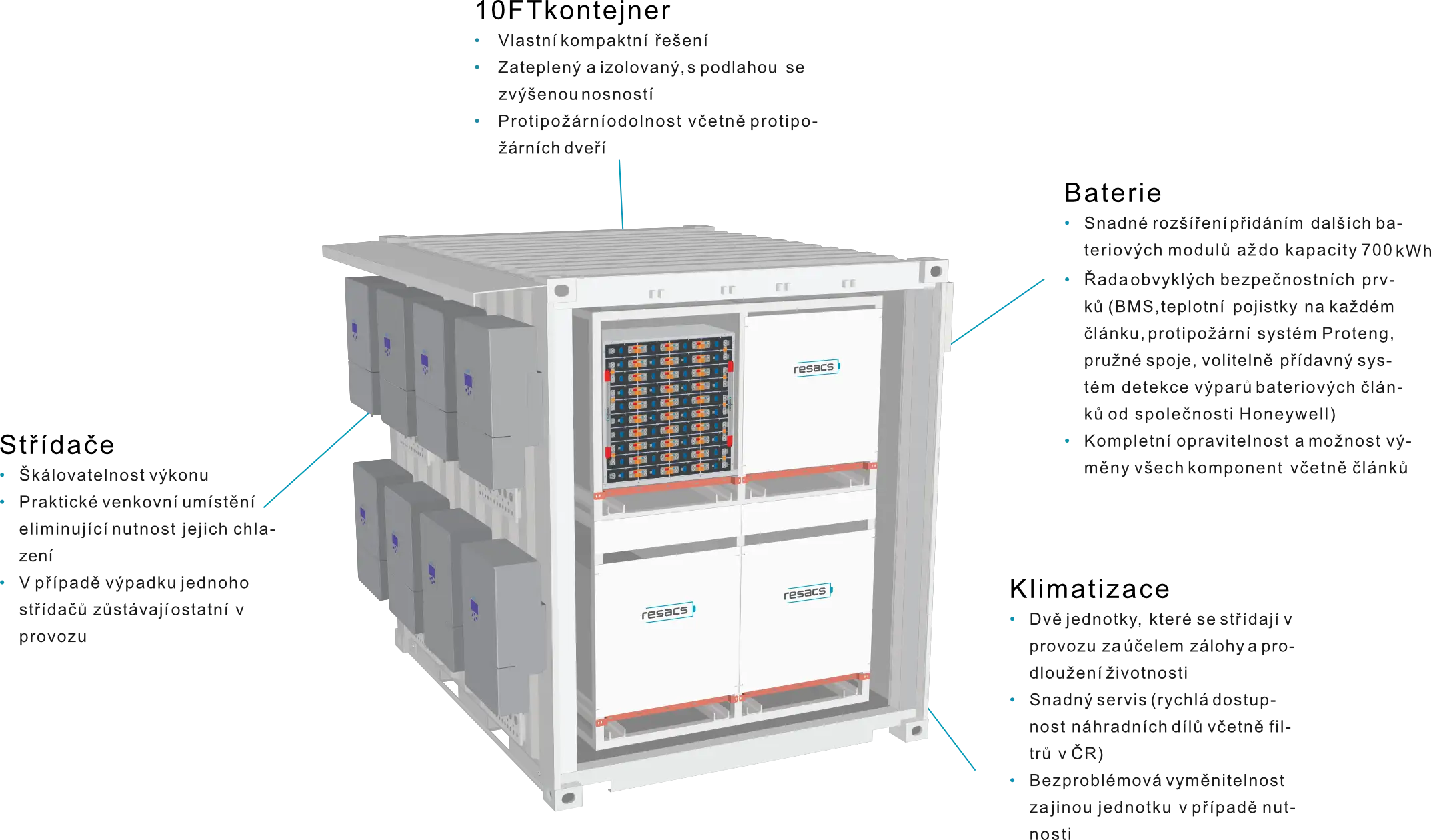 - Lze snadno rozšířit přidáním dalších modulů až na kapacitu 700 kWh