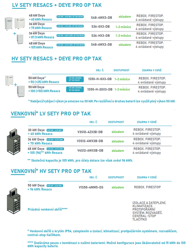 Dotační programy jsou a budou součástí života větších i menších firem. V současné době nastupuje nový Operační program Technologie a aplikace pro konkurenceschopnost (OP TAK), který nahrazuje stávající OP PIK. V roce 2024 tak startuje celá řada zajímavých výzev, kterých se můžete chopit i vy. V rámci OP TAK budou směřovat peníze zejména do oblasti podnikového výzkumu a vývoje, zavádění digitálních technologií ve firmách, nákup moderních výrobních i nevýrobních technologií, inovace ve firmách a především energetické úspory, nákup energeticky účinnějších a úspornějších technologií, získávání energie z obnovitelných zdrojů a rozvoj inteligentních energetických systémů a sítí pro provozovatele energetických soustav (Smart grids). Právě na těch se můžeme podílet i my. Připravili jsme pro vás sety produktů šité na míru dotačnímu programu OP TAK. Můžete si vybrat, zda využijete variantu s akumulací nebo bez ní v rámci Operačního programu Technologie a aplikace pro konkurenceschopnost 2021-2027 (OP TAK).